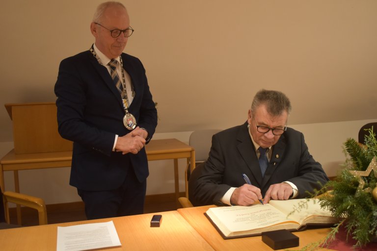 Schließlich überreichte der Bürgermeister die Bürgermedaille und steckte dem Geehrten die Anstecknadel ans Revers. Anschließend trug sich der neue Träger der Medaille ins goldene Buch der Marktgemeinde Geisenhausen ein. Warmherziger Applaus begleitete das feierliche Handeln.