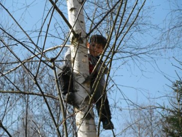 Rucksäcke aufnehmen und Aufbruch in den Wald.