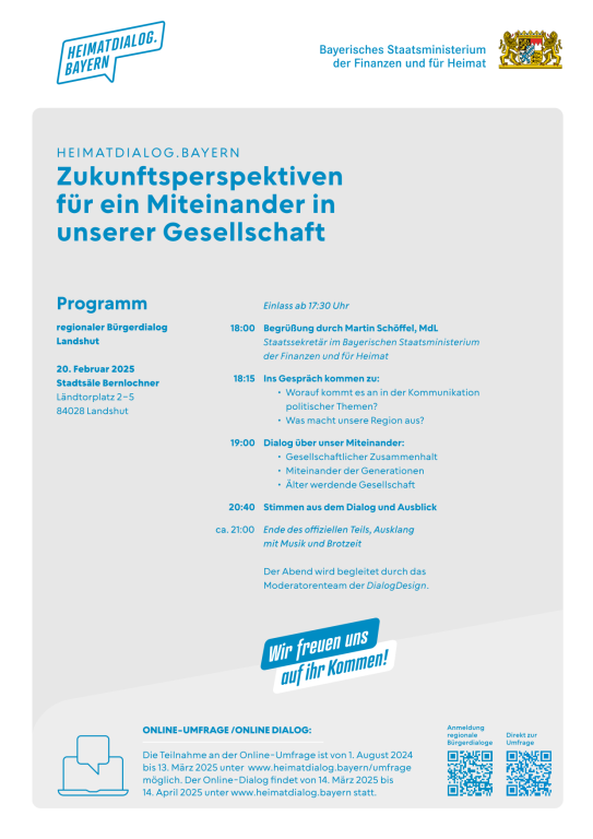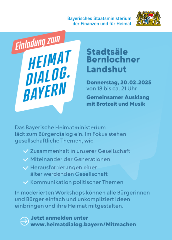 Anmeldelink zum Vor-Ort Termin: www.heimatdialog.bayern/landshut (Anmeldung bitte bis möglichst 17. Februar 2025, für Verpflegung ist gesorgt – eine Teilnahme ist ab 16 Jahren möglich)